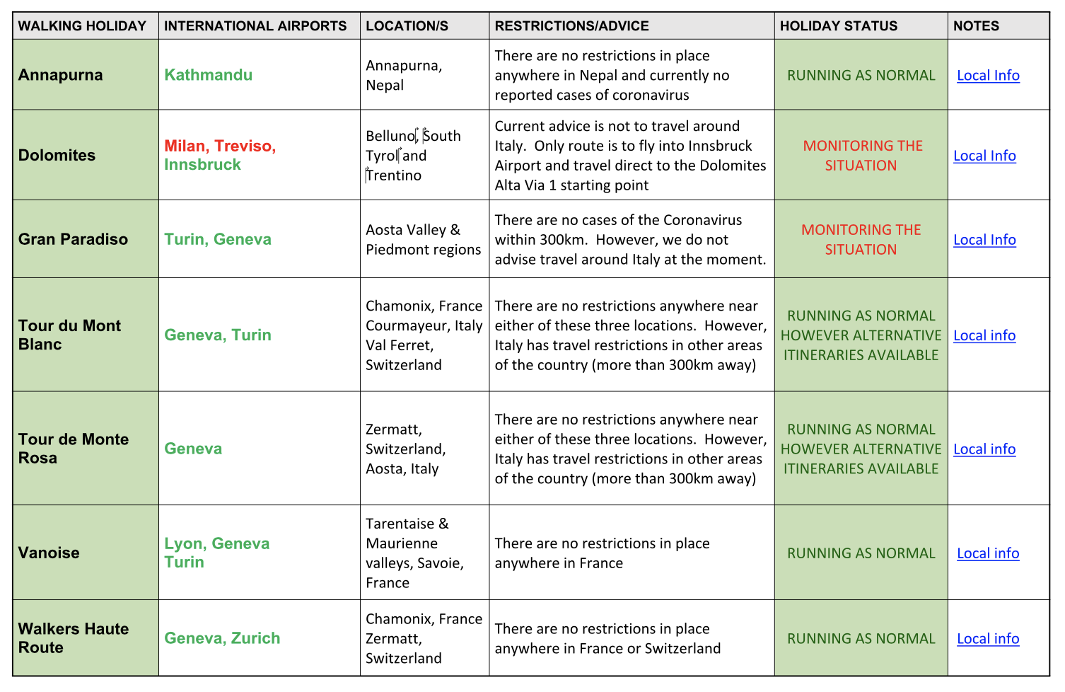 We are monitoring all local advice in the French, Italian and Swiss Alps to make decisions on our walking holidays.