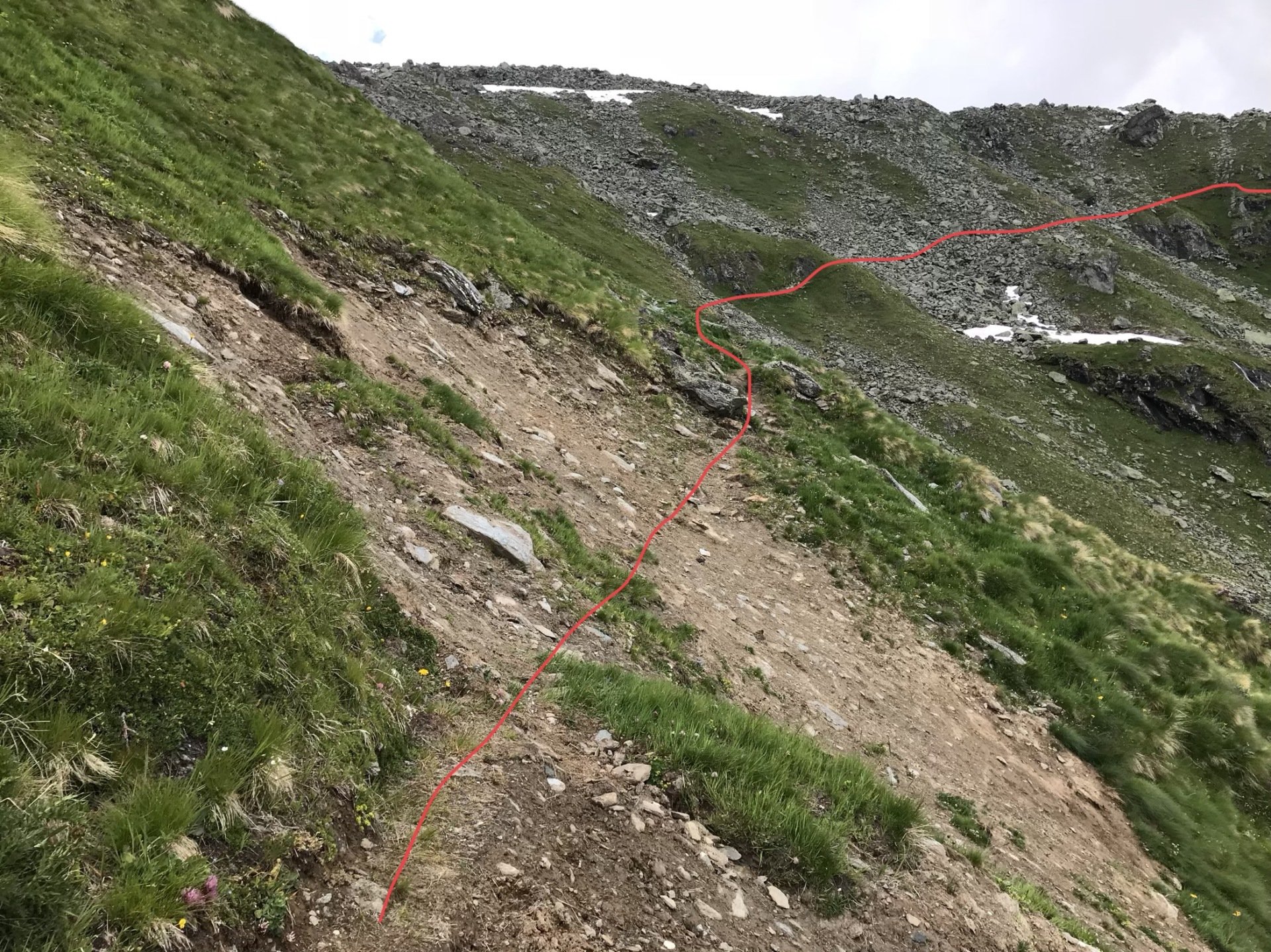 The path from the Cabane du Mont Fort clings to the mountainside & is very exposed in sections especially after the Col du Termin. The section from the Col du Termin to the Col du Louvie after the winter has deteriorated massively & in some sections the path has fallen away from the hillside. There are still snow patches in certain sections & traversing Great care needs to be taken if taking this route as a trip or slip could be fatal on the eroded sections.
