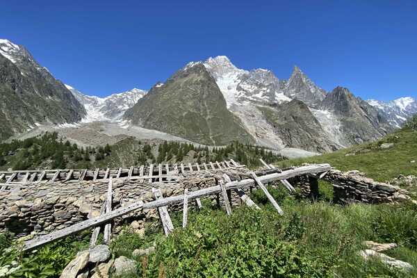Taking the local bus one again into the Val Veny to La Visialle this fabulous route takes you on one of the best sections of the Tour du Mont Blanc. At Lac Combal you ascend steeply into the beautiful Arp valley to the old farm ruins of l’Arp Vieille. Continue with Mont Blanc as your backdrop and far reaching views over towards the Swiss Alps. Traverse high above the Val Veny and descend through the ski area back to Courmayeur.