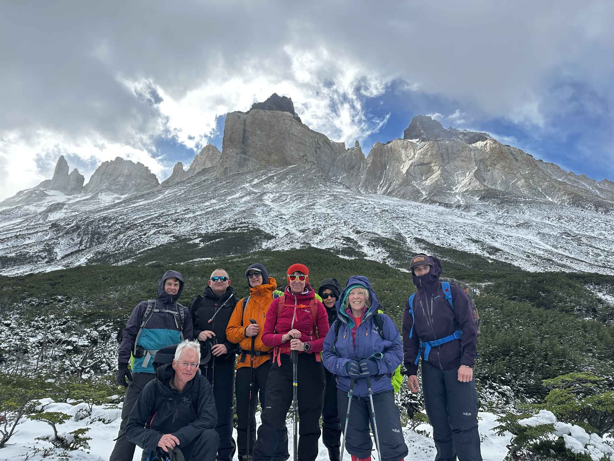 The hike to the base of the Torres del Paine on a snowy, cold day was a challenging experience. We started early from Hotel Las Torres before the day trippers arrived via bus from Puerto Natales. The trail ascends through the Ascencio Valley, with snow falling as we climbed. Visibility was limited, and the usual stunning views were obscured by thick clouds and falling snow. After refreshments at the Chileno refuge, we continued through woodland that brought us to the final steep section on moraine and snow-covered boulders. At the top, the iconic towers were hidden behind mist, disappointing not to see them but a beautiful day in it's own way. We headed back to the hotel via the same route, where a hot shower, warm bar, and good meal awaited us.