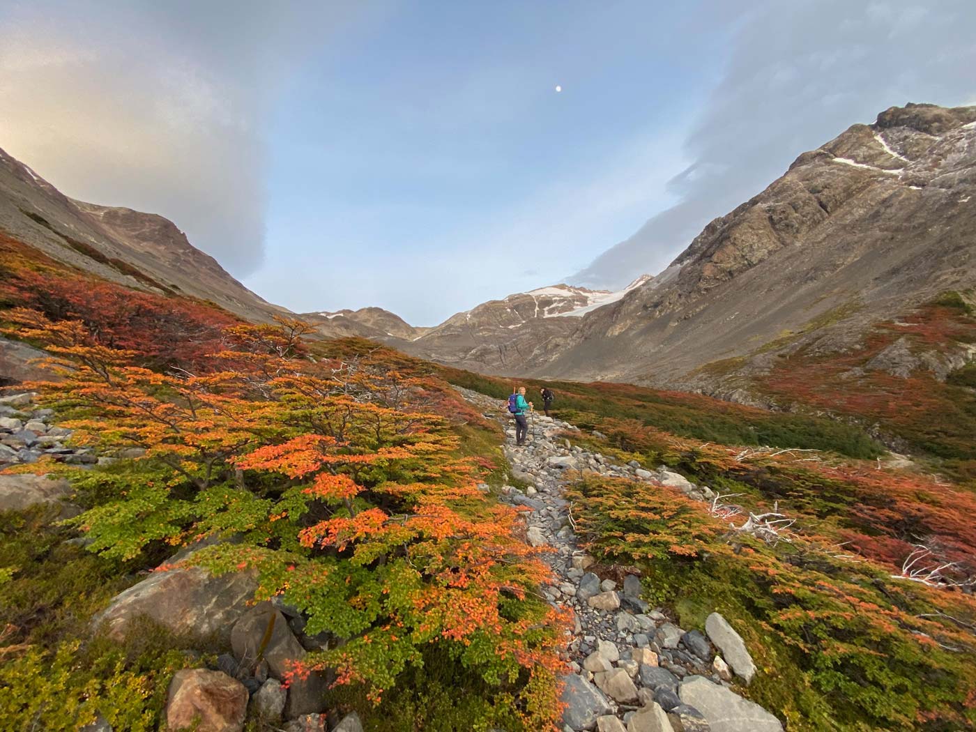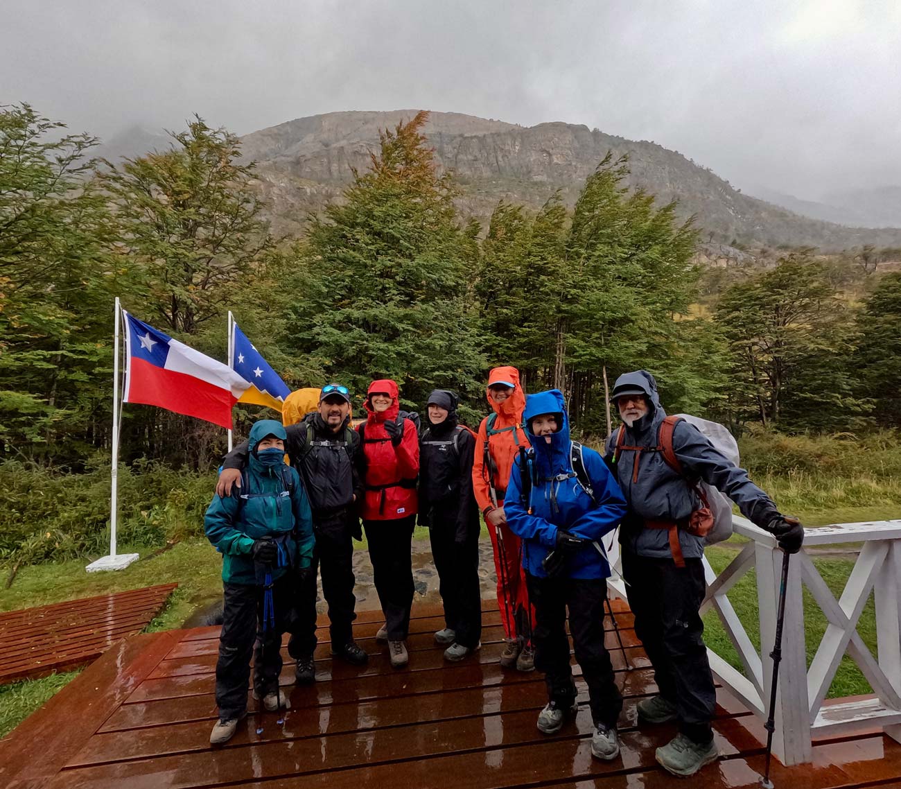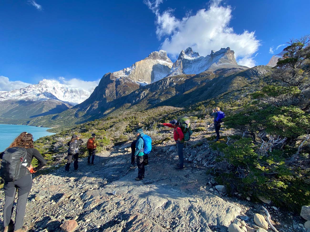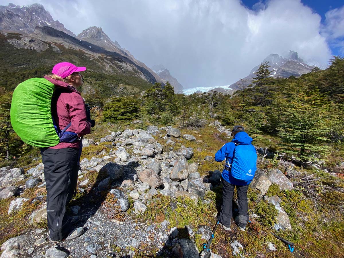 Day 6 – A 7am breakfast again, softened slightly for me by the presence of real Twinings tea bags and for the Canadian contingent by the presence of a proper coffee machine. Small pleasures! Our plan today for the enthusiastic, fit team members was to hike to our cabins at the Cuernos campsite via the French Valley & French lookout. Others, with coughs etc would go directly to Cuernos. Unfortunately, the plan was utterly scuppered by the Rangers shutting the footpath up the French valley (the steady rain over the last couple of days had made the river crossing too dangerous) so we all hiked together for the day. This is the section along the edge of the Nord Skold Lake, so different terrain again, looking up at the imposing Cuernos (horns) high above us.