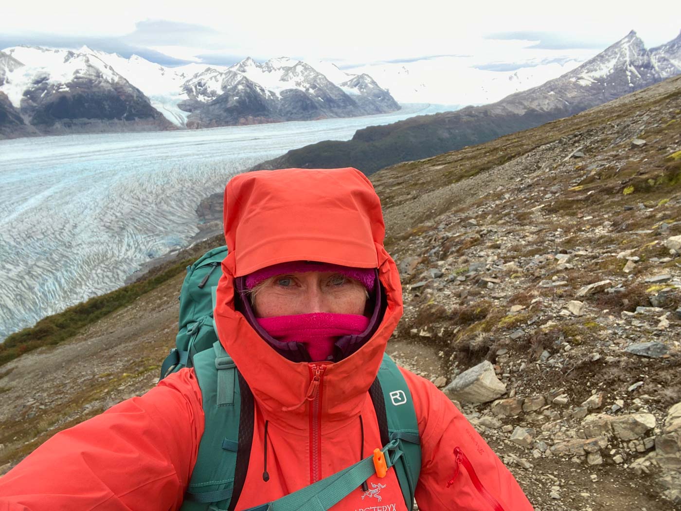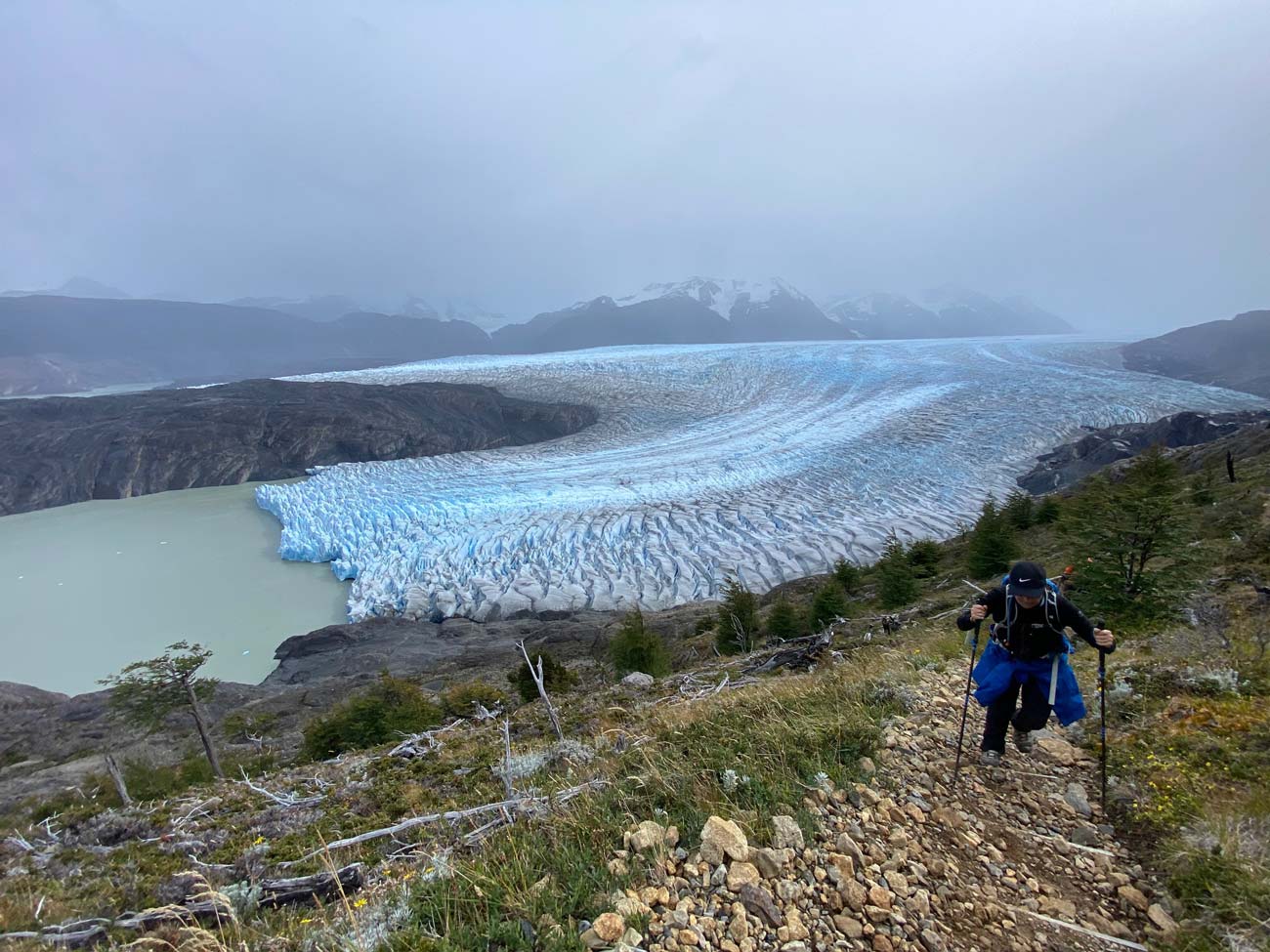 Day 4 – The one redeeming feature of sleeping at Los Perros is that it’s a short night…breakfast was 5:30am and we were hiking in the dark with head-torches by 6:30am. Not all hikers leaving the campsite were lucky enough to be following a guide on the unclear, muddy trail and during the first 30 minutes several people emerged from the forest having had their own personal mystery tours in completely the wrong direction. Thankfully the slippy logs, deep puddles and soggy mud were soon left behind as we headed up onto firmer ground and the trail up to the John Gardner Pass. We were honoured with a fabulous dawn and clear views in all directions as we climbed up to the Pass. Clearly someone in our team had made the correct sacrifice to the weather gods because it stayed clear for us on the Pass itself…if somewhat chilly (I was wearing EVERYTHING as we descended). The view from here is unbelievably spectacular over the enormous Grey glacier and right out onto the rest of the Southern Patagonian Icefield.