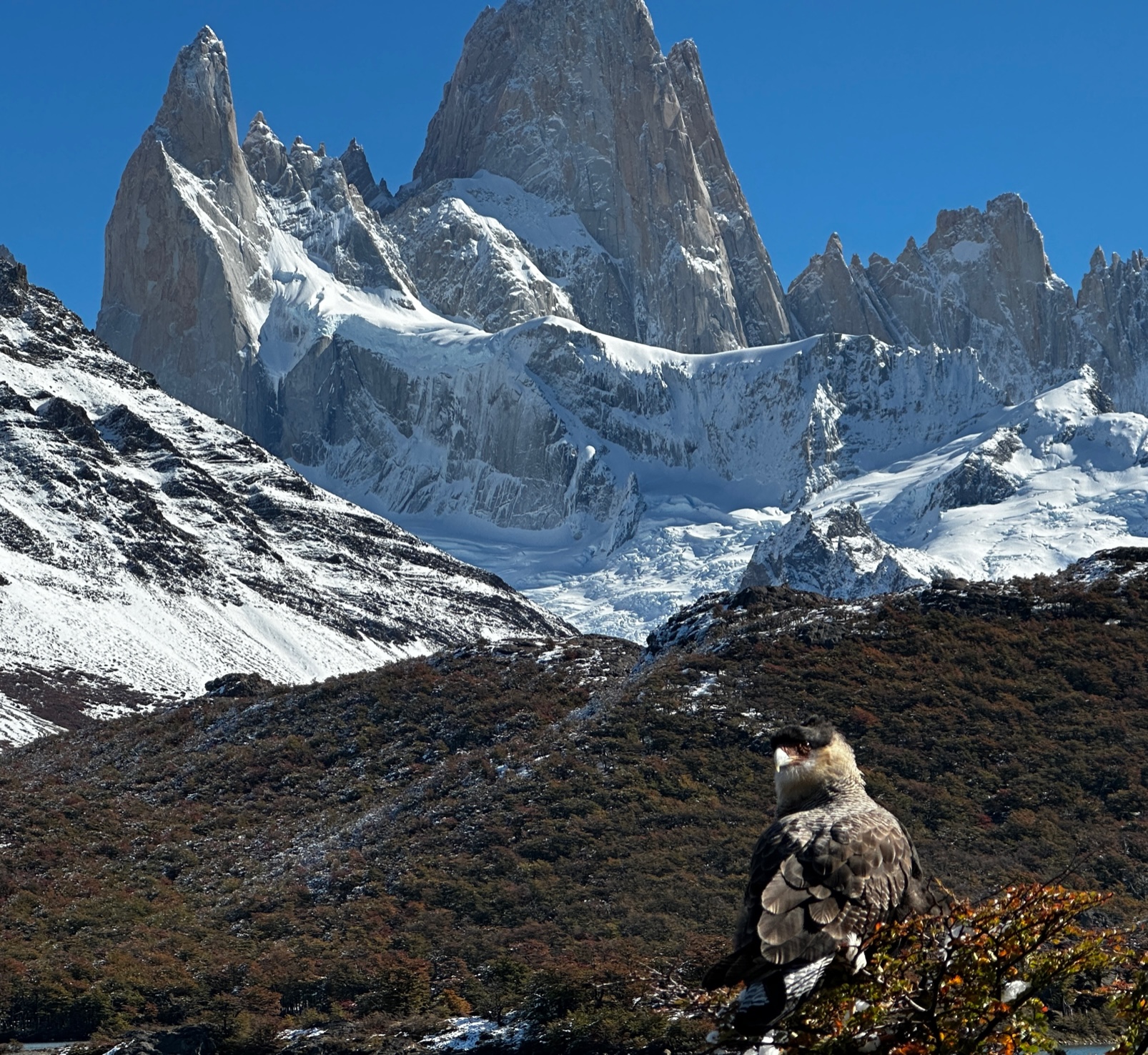 Soon after our arrival in El Chalten we began a round trip trail, this gave us a great idea of the opportunities around that area. We walked on relatively easy terrain to a popular viewpoint with fabulous views of Fitz Roy. Yet again abundant wildlife was evident, birds of prey are a common sight here. We photographed a friendly Caracara posing alongside the lake and sat down for a moment in admiration and wonder. With fresh snow cover on the ground the WOW factor of our trekking adventure into Patagonia was complete!
