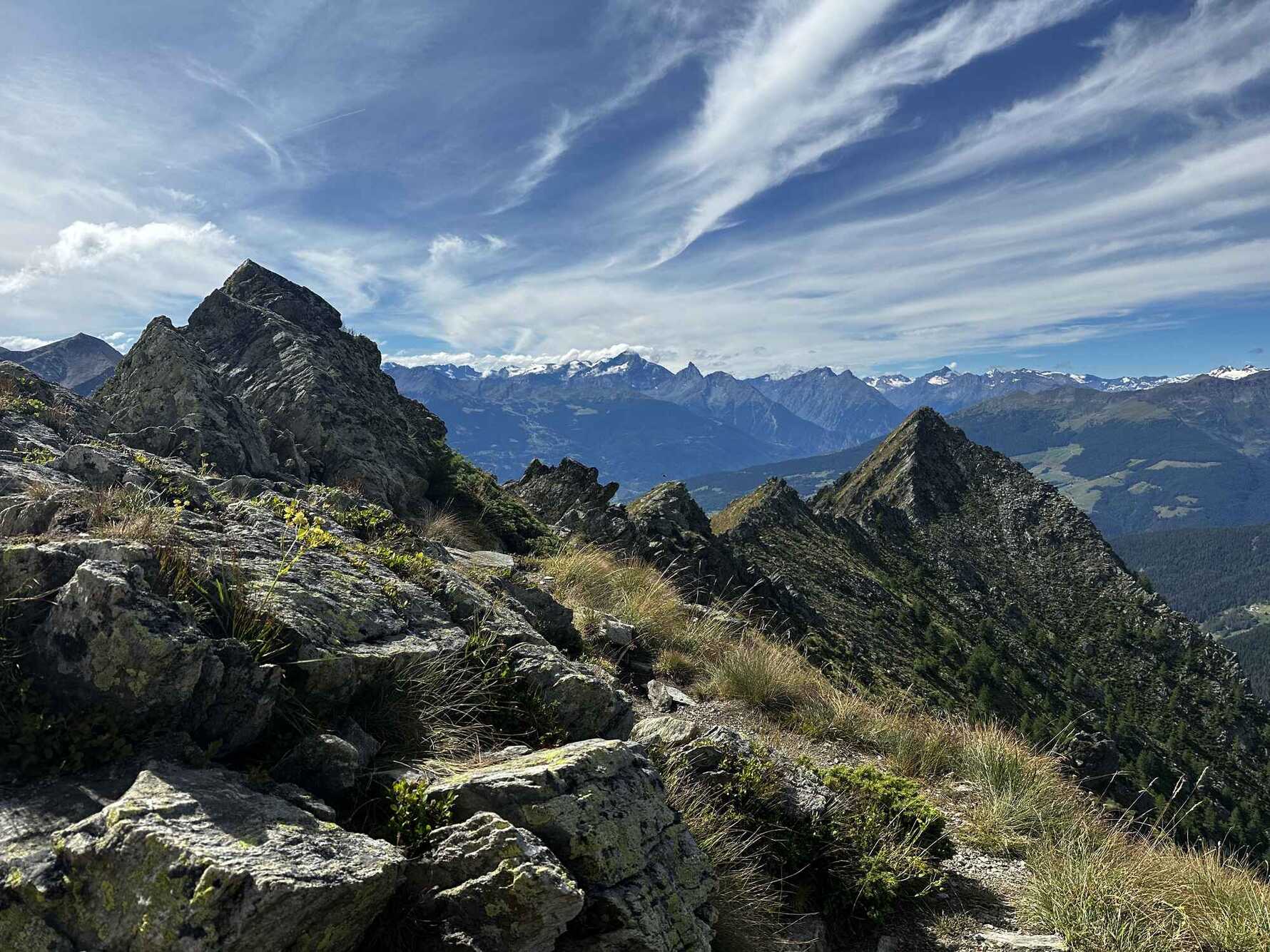 An early morning bus from Valpelline took us to our starting point at Closé. We climbed up through woodlands into steeper, more open terrain. A beautiful, high-altitude traverse led us to Col de Brison at 2,480 meters, offering fabulous views toward Gran Paradiso and Mont Blanc. From here, it was all downhill—the trail descended steeply, taking us into the Ollomont valley.