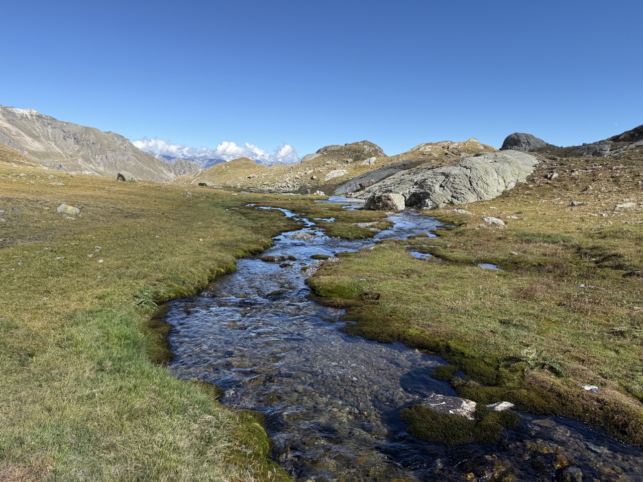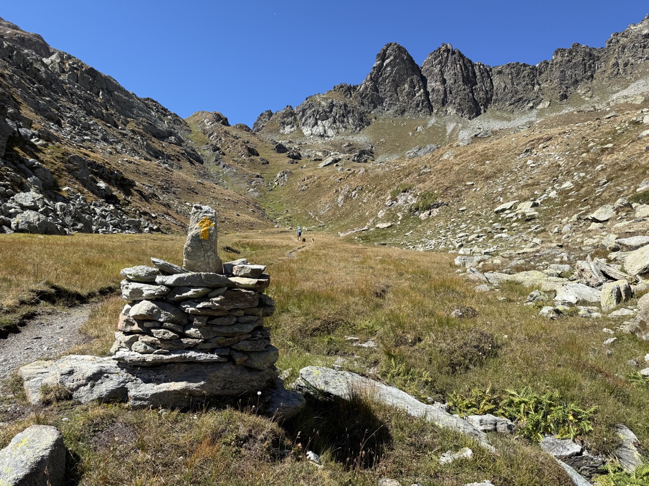 From the col, the route drops sharply into the Vallée de Vessona, a steep and sustained descent that demands focus, especially after several demanding days already in the legs. Gradually, the terrain eases and the valley opens out, guiding the way down to Closé.