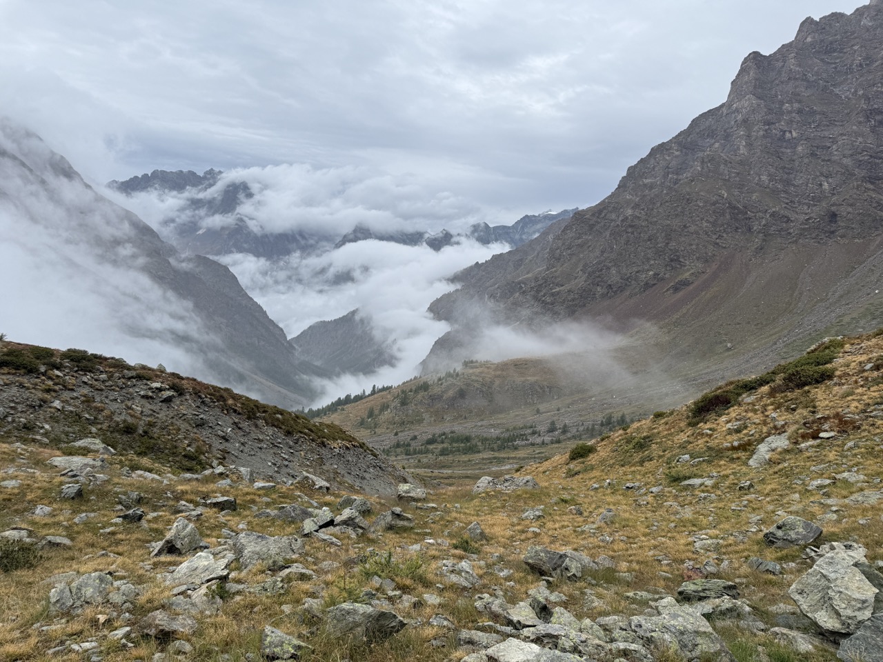 Leaving Rifugio Cuney, the trail climbs steadily to Col de Chalaky (2,683m) before continuing on to Col de Vessona (2,788m). In clear conditions, this stretch offers expansive views across the surrounding peaks, but today the landscape felt more intimate and atmospheric, with the mountains only occasionally revealing themselves through the cloud.