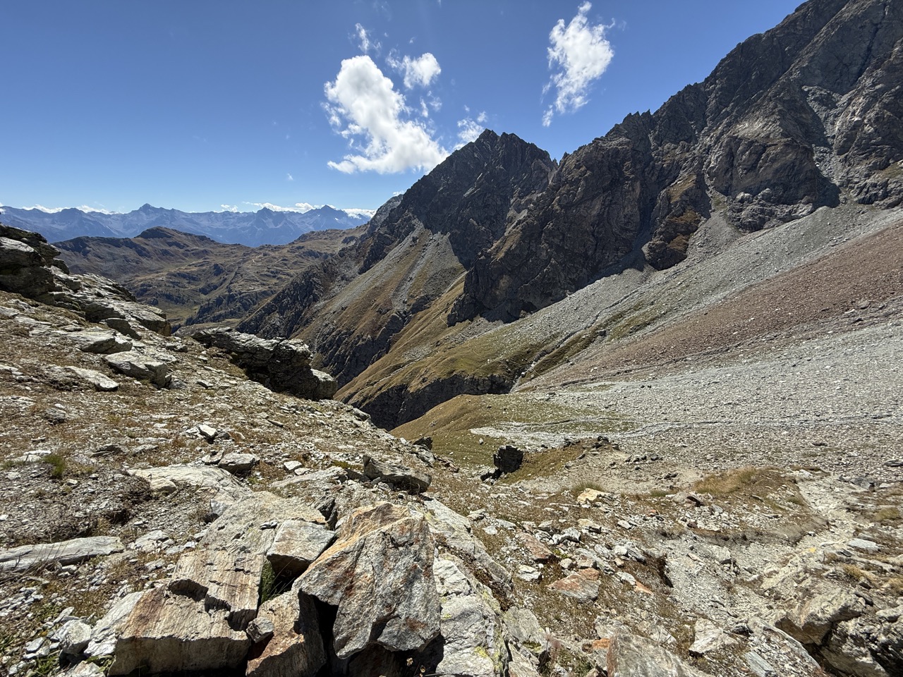 Leaving Rifugio Barmasse, the trail climbs through rugged, high-mountain ground, with effort rewarded at the Finestra d’Ersa (2,290m). Looking back from here, the views across to the Monte Rosa massif are superb and provide a natural pause before pressing on.
