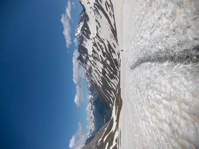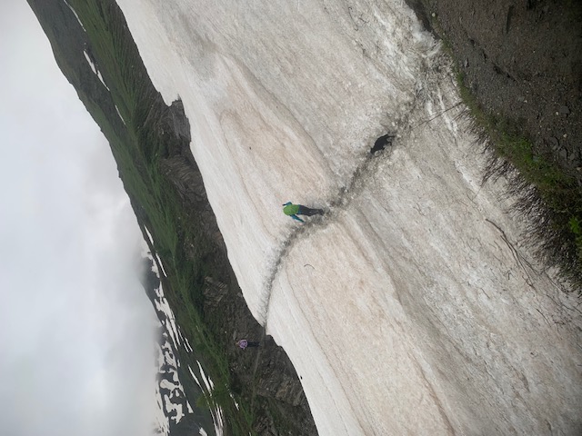 However there is a remarkable amount of people out travelling the TMB, the busiest June I have seen in 16 yrs guiding on this route. Therefore there are good tracks to follow through any of the snow fields/ passages making route finding and snow conditions easier to follow. However there are some sections that require a steady head and good equipment, the tracks are easy to follow but a slip could be fatal in some areas.