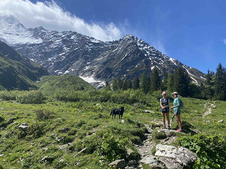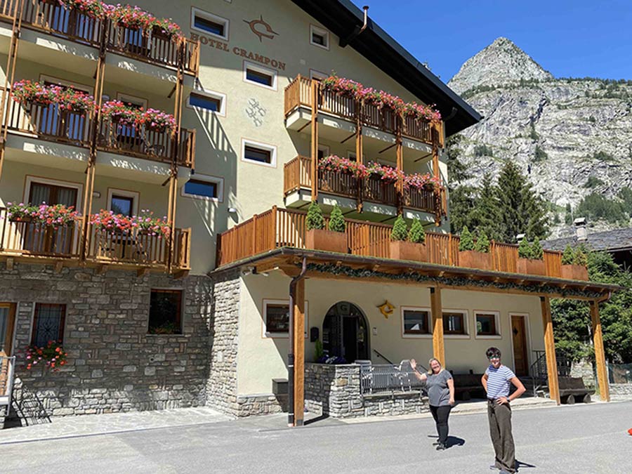 Amongst all this flora were a host of seemingly tame, furry, marmots. This was the closest encounter I'd had with these cute mountain creatures. Before the long climb up to Maison Vielle and a welcome drink stop, another first was had. We met a wonderful Slovakian hiker, practising high altitude yoga. He talked us into a balancing act with him as the base, the Italian side of Mt Blanc was the backdrop. We descended the hard way through the woods into Courmayeur. The welcome from Lorenza and Alicia at the beautiful Hotel Crampon where we enjoyed the best bed and breakfast possible was second to none.