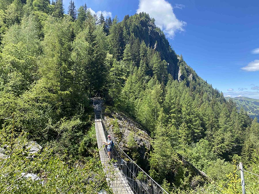 Day 1: Col de Tricot (the prologue - was I fit enough for a day hike?). With packed lunches, plenty of water and Margo the MBT dog we set out from Les Houches to Col de Tricot. The day was beautiful (il fait chaud), we hiked up past the ski areas of le Prarion. A suspension bridge spanned the torrent of a high mountain river. We made our way above the tree line and up the col which topping out in the snow at 2036 m above sea level with spectacular views of Mt Blanc. 18 km in just over 6 hrs was a big day for me (and Margo), but what a joy to be out in the high mountains again.