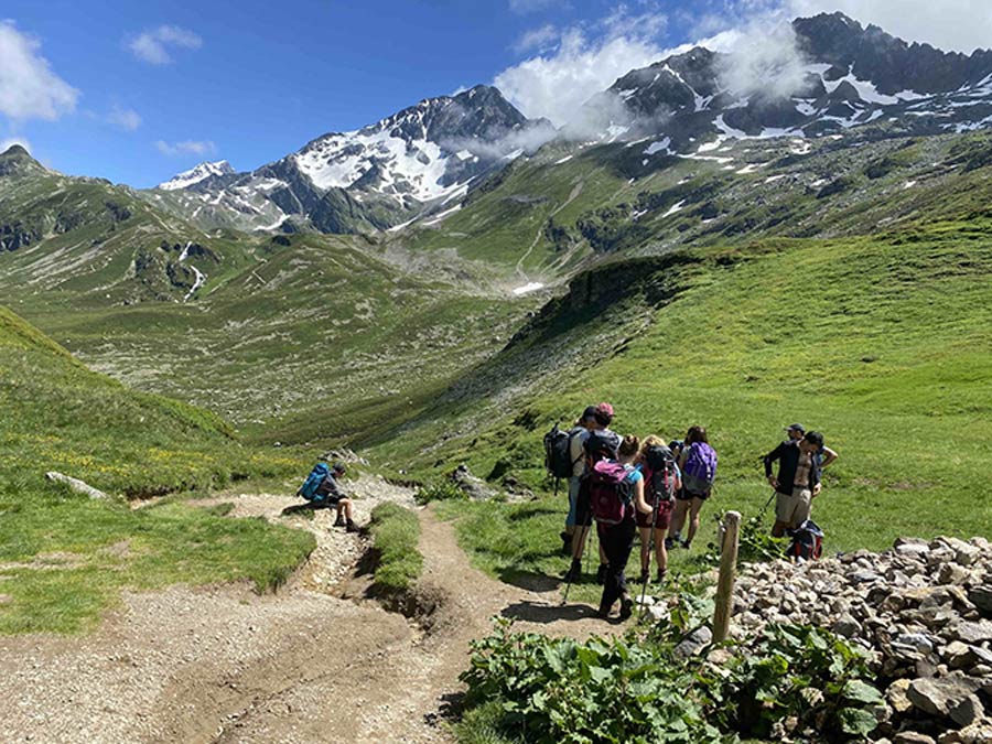 Day 2: Les Contamines to Refuge Mottets. 19.9km, 6.5 hrs, 2569m, This was described to me as the hardest day of the TMB, three big cols to climb! We set off briskly, hiking up through the beautiful Contamines valley towards the Col de Bonhomme, Croix de Bonhomme and Col de Fours carrying our gear for an overnight at Refuge Mottets. Friendly local hikers, fishing groups and expat group from Morzine were good company at the top of the Bonhomme.