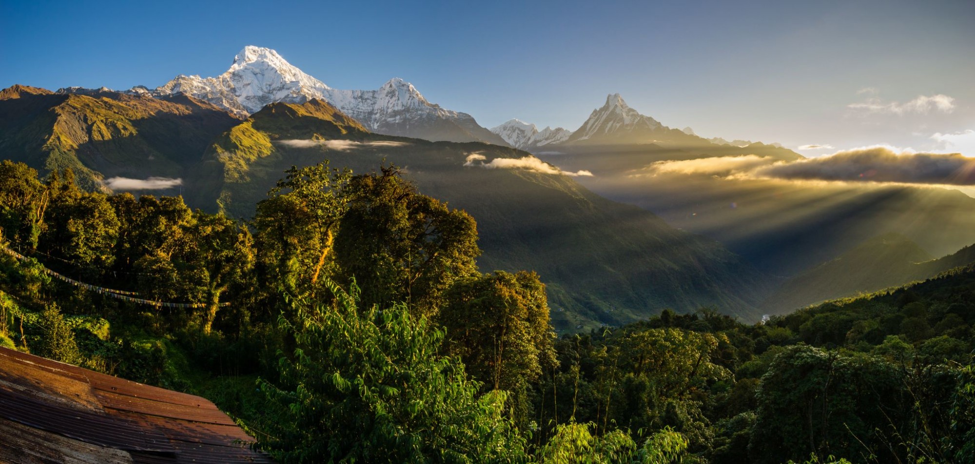 We start the trail in Nayapul, 26 kilometres from Pokhara. A humid, monkey and banana tree start with a bang! Trekking through your tropical first day, you’ll probably be asking yourself why you brought all these warm clothes. (You’ll realise why when you get above 3,000 metres.)